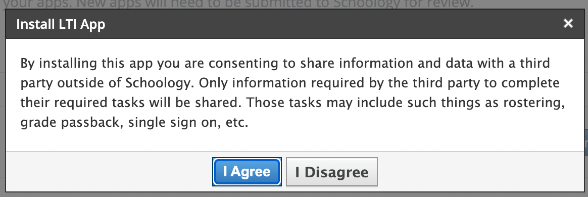- Click "Continue" to authorize the app to use "Deep Linking" and "Assignment and Grade Services" (these are required for the app to create assignments and pass back grades to Schoology).